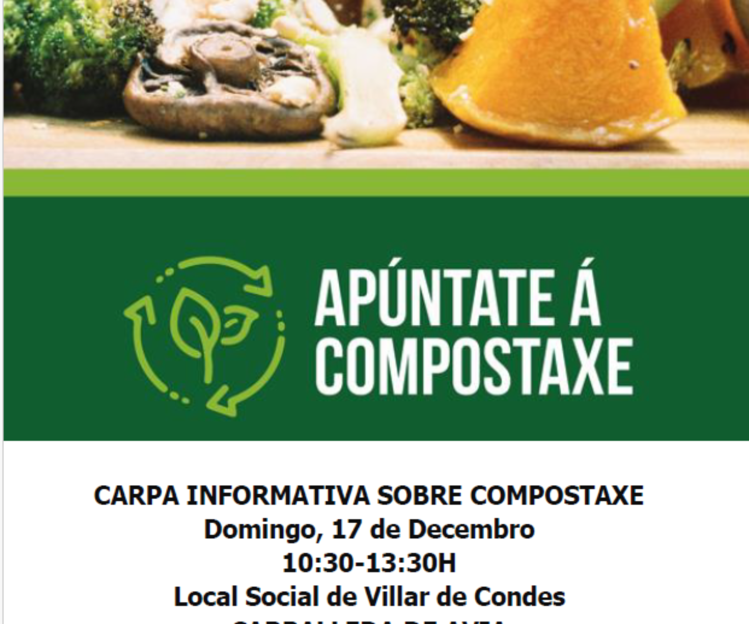 Anuncios, Eventos, Medio Ambiente, Novas 18 Dic 2023 Apúntate á compostaxe O pasado domingo , día 17 de decembro instalouse en Villar de Condes unha carpa informativa sobre á compostaxe tal… Info