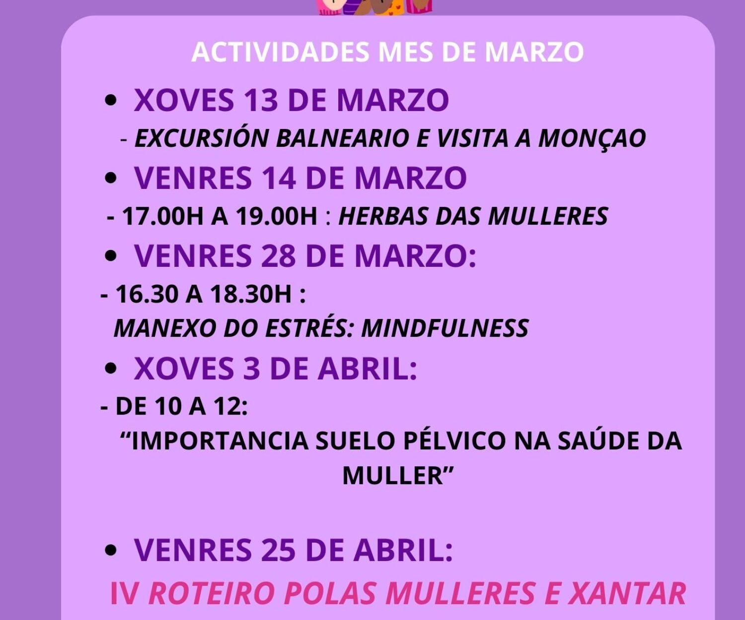 Actividades CIM, Anuncios, CIM - Centro De Información Á Muller, Novas 18 Mar 2025 MES DE MARZO: MES DAS MULLERES Mes de Marzo: Mes das Mulleres Dende o CIM de Carballeda de Avia, este mes de marzo propoñemos diferentes activdades… Info