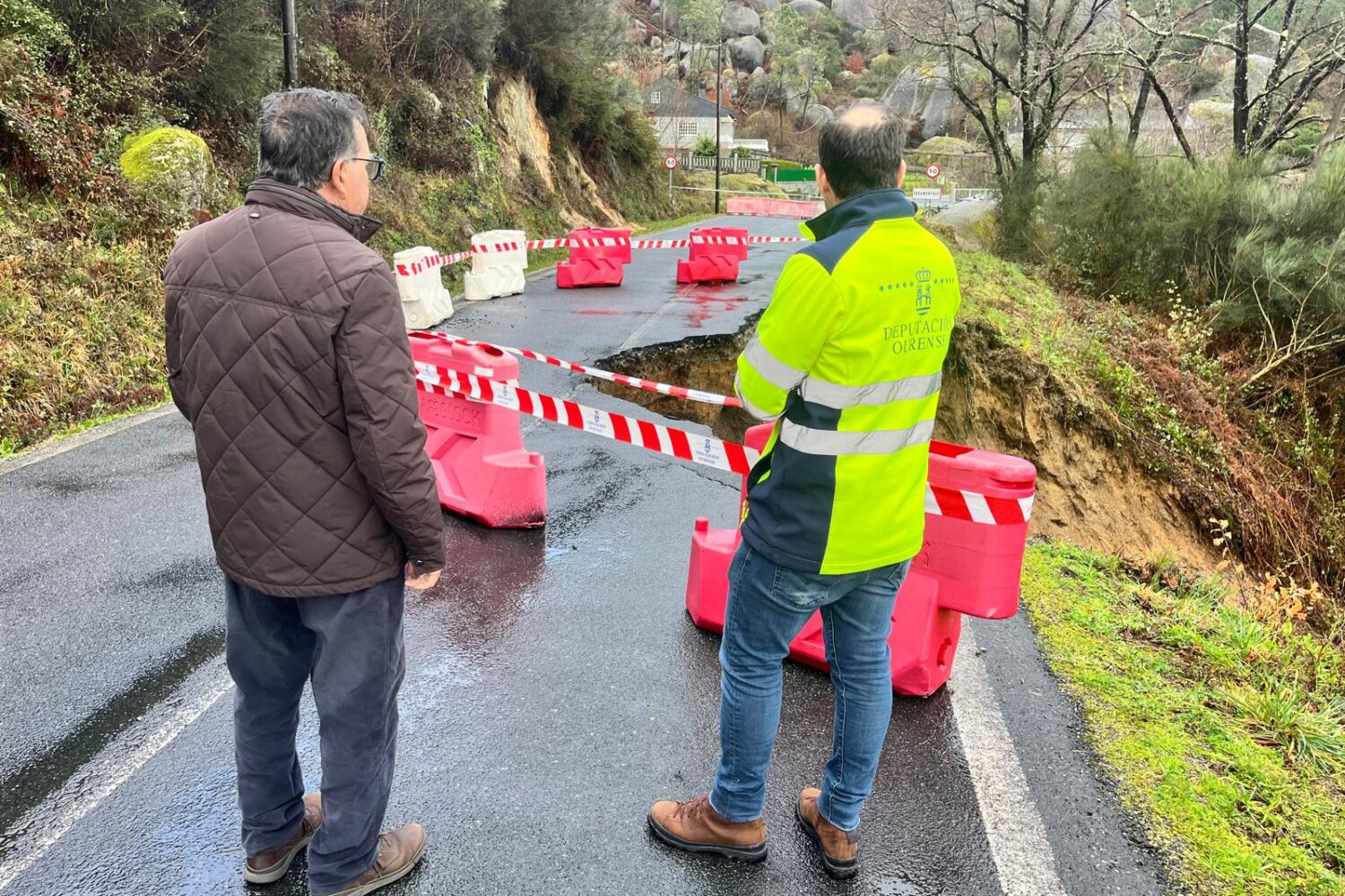 O alcalde comprobou a zona co Xefe de Conservación e Explotación do Servizo de Vías e Obras da Deputación de Ourense e co persoal técnico, para facer unha valoración inicial dos danos e organizar os traballos de reconstrucción neste punto, tamén se valoraron outras reparacións de taludes e bolsas de auga provocadas polas sucesivas borrascas. A reparación é complexa e aínda non se poden establecer plazos de finalización das tarefas, pero dende primeiro momento se está traballando para solucionalo.
