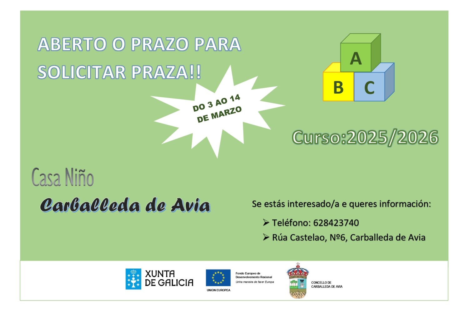 26 Feb 2025 Info Anuncios, educación., Novas 26/02/2025 Info ABERTO O PRAZO PARA SOLICITAR PRAZA NA CASA NIÑO DE CARBALLEDA DE AVIA Do 3 o 14 de marzo abre o prazo para solicitar praza na Casa Niño de Carballeda de Avia. Un servicio gratuito para nenos e nenas con idades comprendidas entre os 3 meses e os 3 anos. Non dubides en pedir información no 628423740