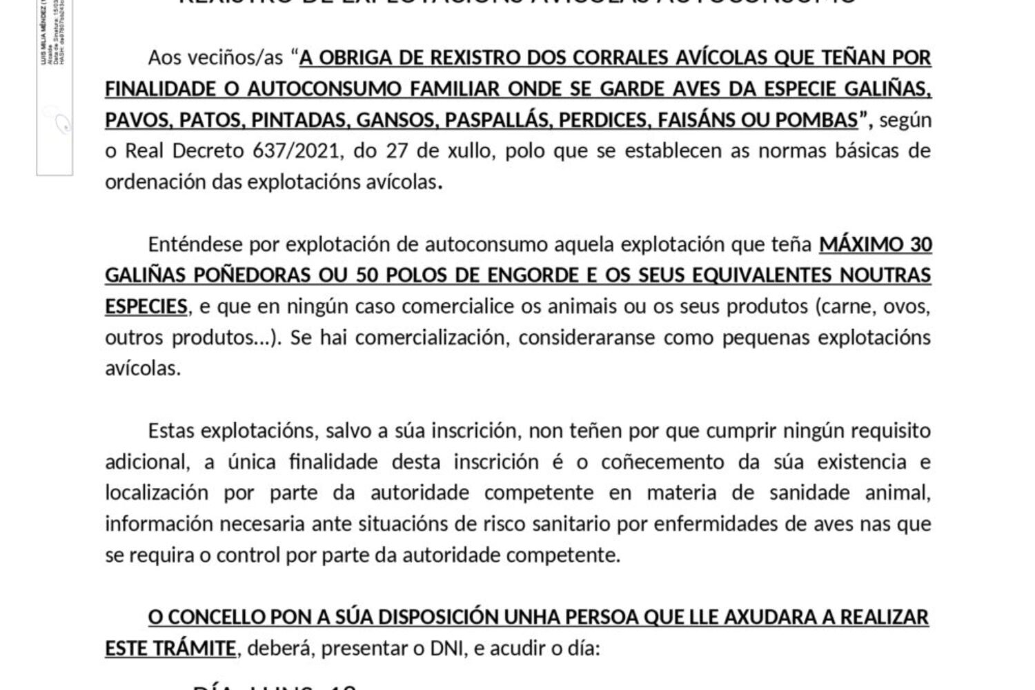 O CONCELLO PON A SÚA DISPOSICIÓN UNHA PERSOA QUE LLE AXUDARÁ A REALIZAR O TRÁMITE, REXISTRO DE EXPLOTACIÓNS AVÍCOLAS AUTOCONSUMO