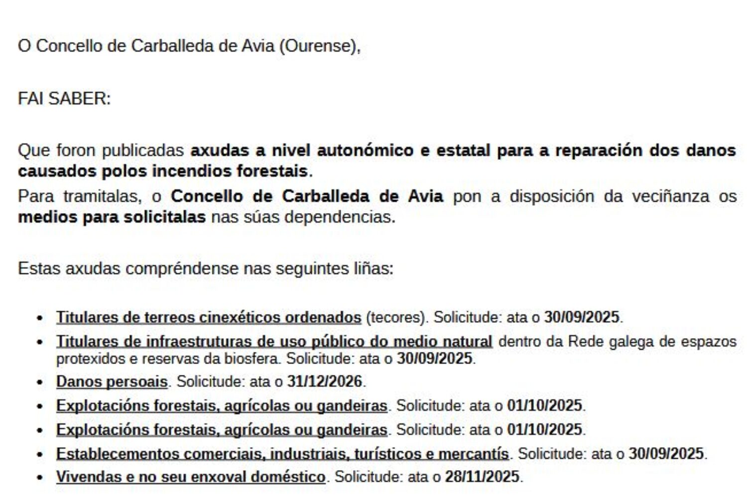 Que foron publicadas axudas a nivel autonómico e estatal para a reparación dos danos causados polos incendios forestais.