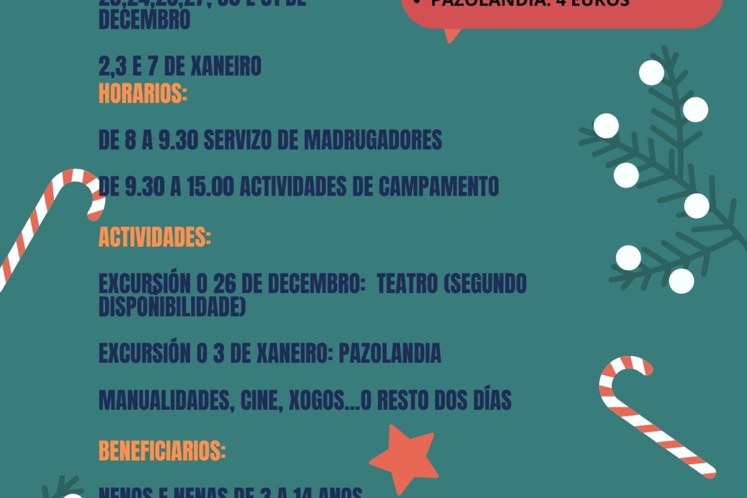 A entrega das inscriciós da asistencia ao Campamento de Nadal e ao Teatro será como moi tarde ata o venres 20 de Decembro no concello, no colexio ou remindo a inscrción firmada ao correo [email protected].