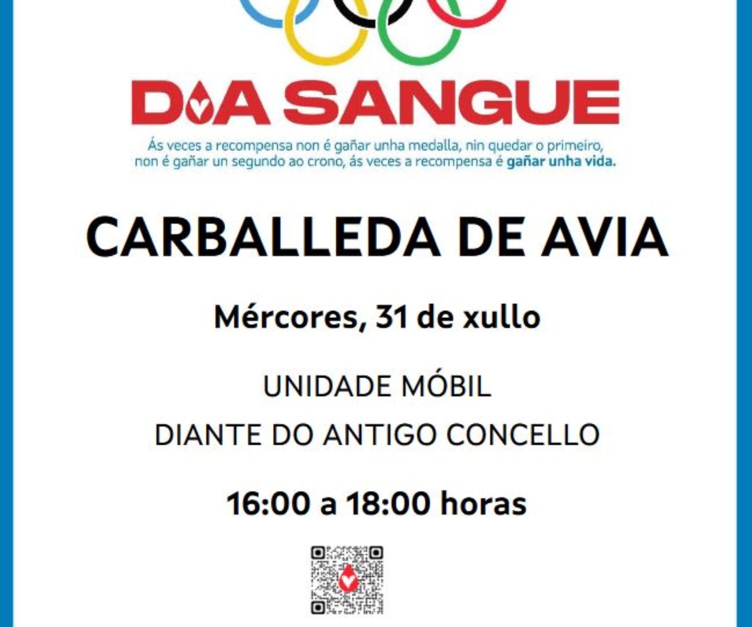 Anuncios, Eventos 23 Jul 2024 CAMPAÑA DE DOAZÓN DE SANGUE DIA 31 DE XULLO A Axencia Galega de Sangue, Órganos e Tecidos habilitará unha unidade móbil en Carballeda de Avia o vindeiro mércores, 31… Info