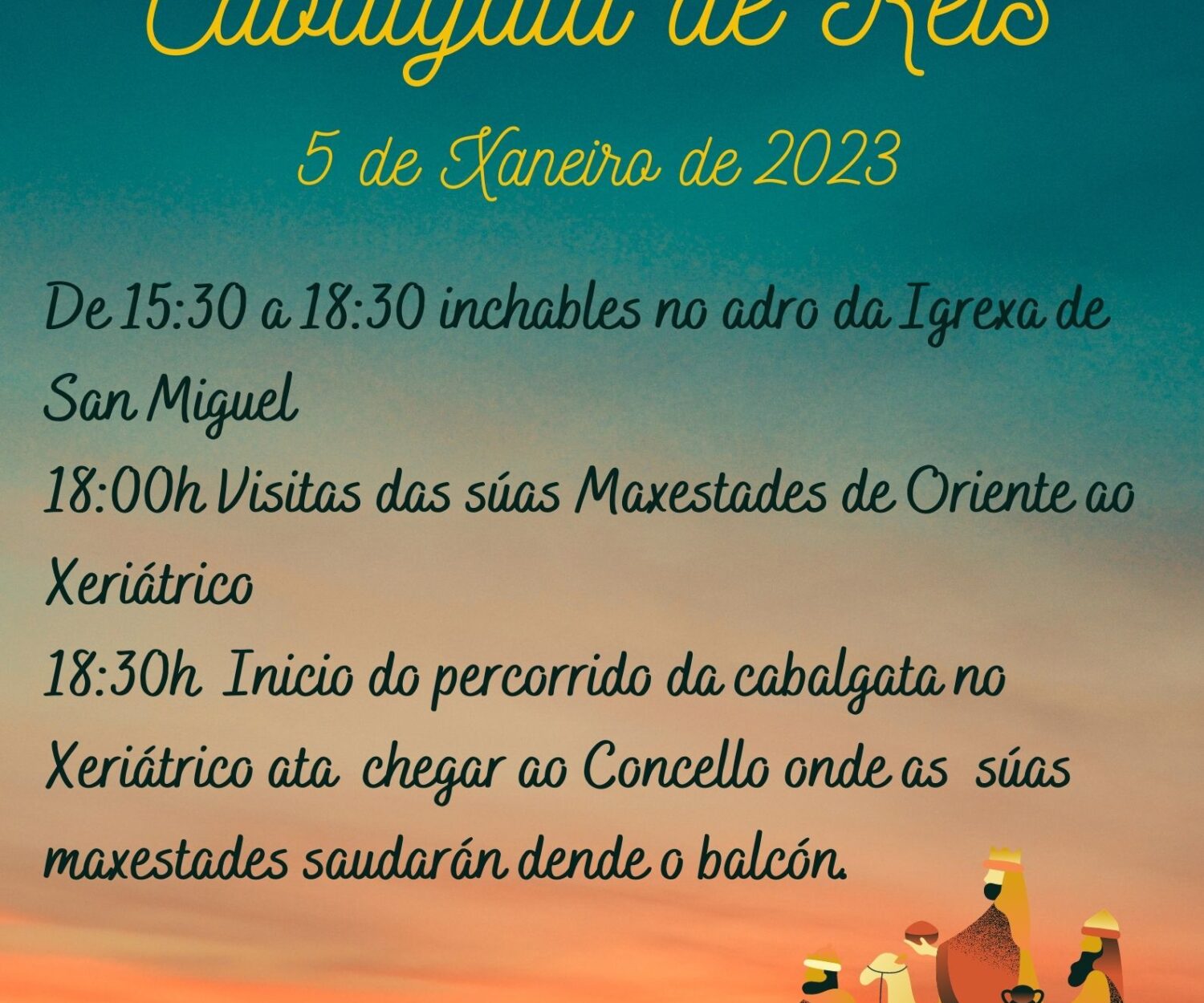 Anuncios, Eventos, Novas, Turismo 02 Ene 2023 Cabalgata de Reis Como tódolos anos o vindeiro 5 de xaneiro teremos no noso concello a visita das Súas Maxestades de Oriente. De… Info