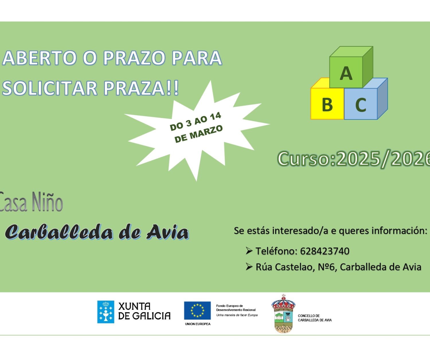 Anuncios, educación., Novas 26 Feb 2025 ABERTO O PRAZO PARA SOLICITAR PRAZA NA CASA NIÑO DE CARBALLEDA DE AVIA Do 3 o 14 de marzo abre o prazo para solicitar praza na Casa Niño de Carballeda de Avia. Un… Info