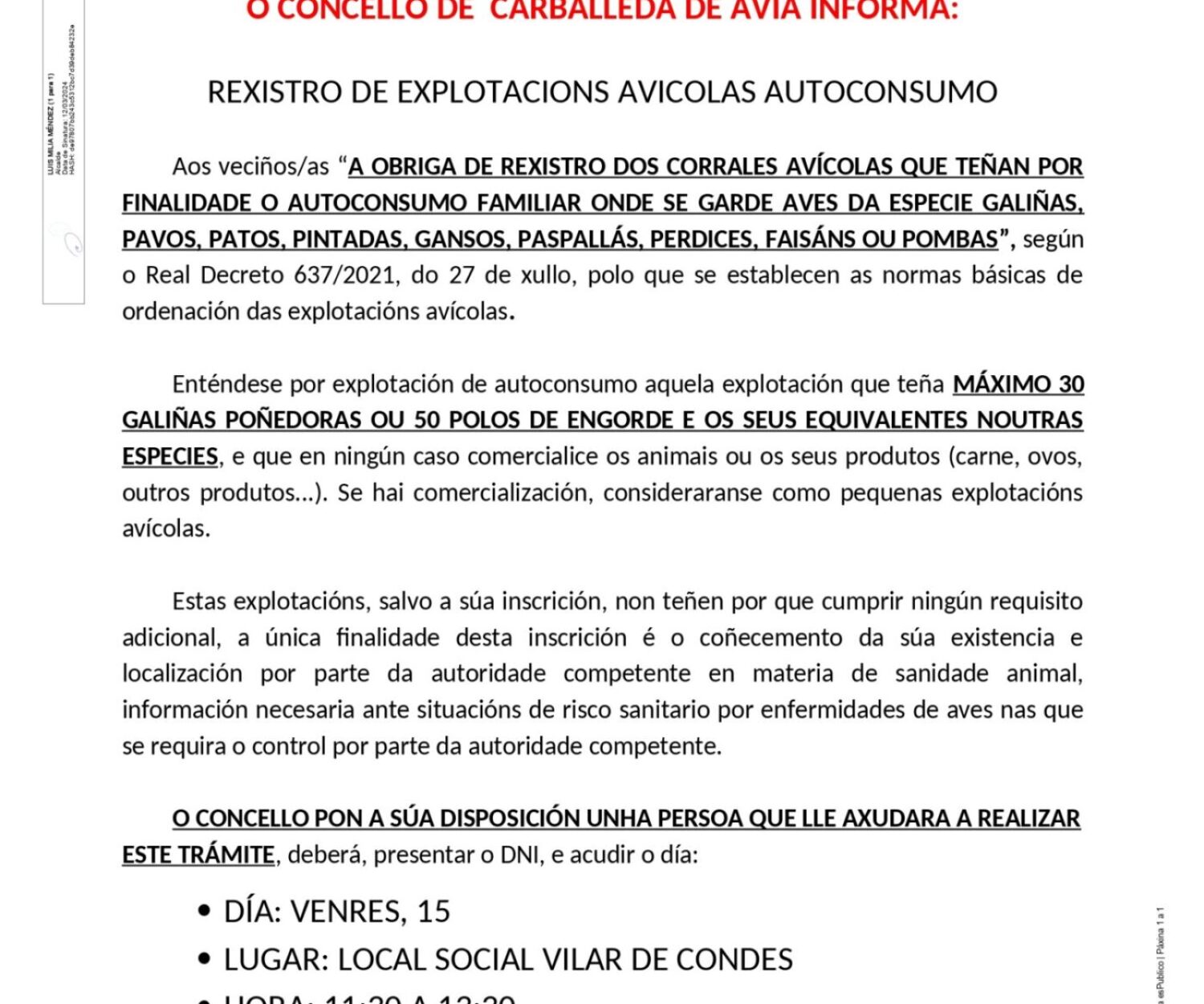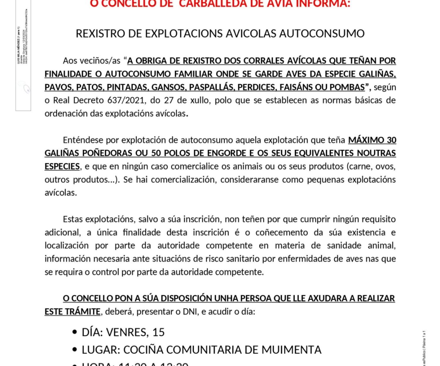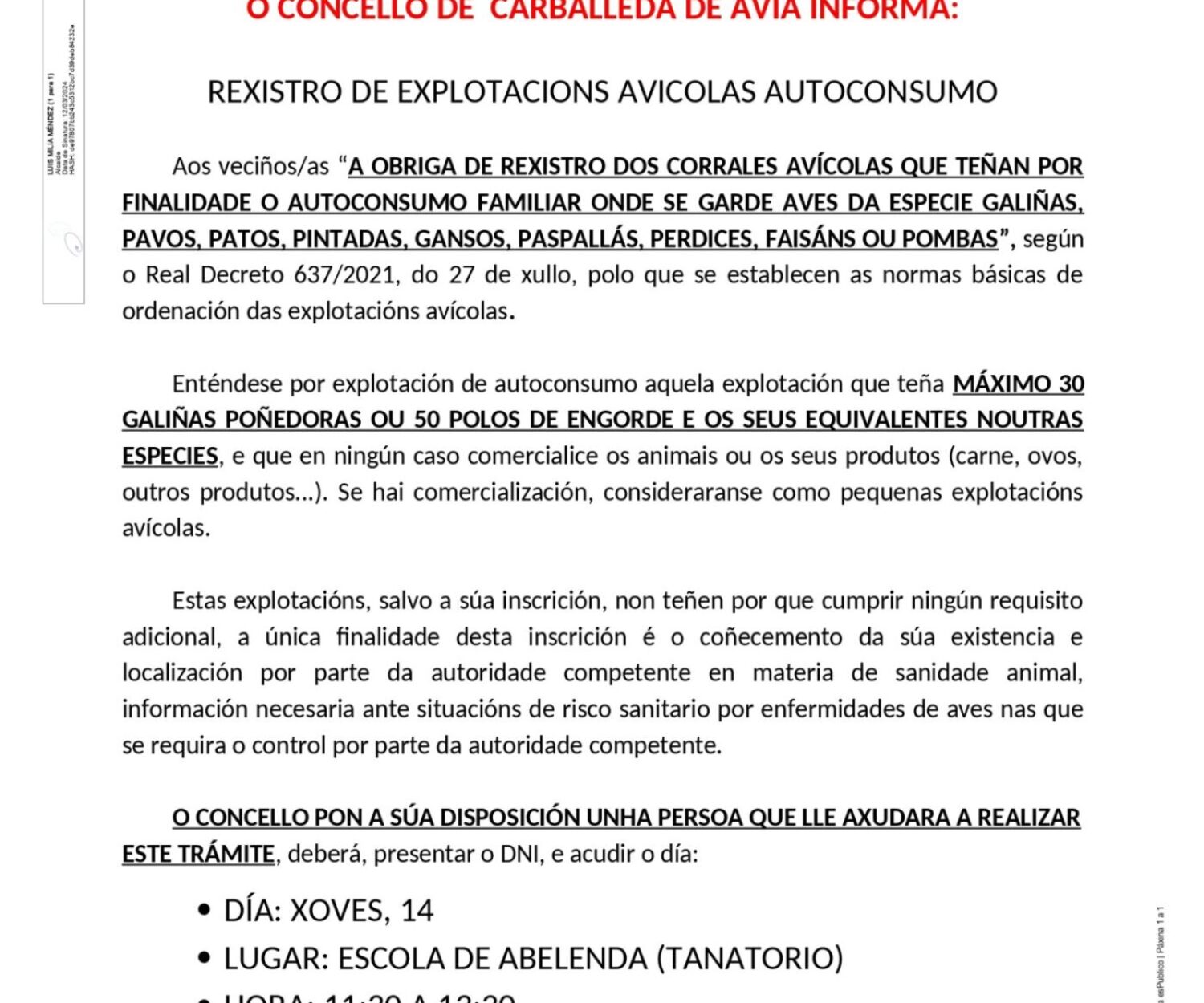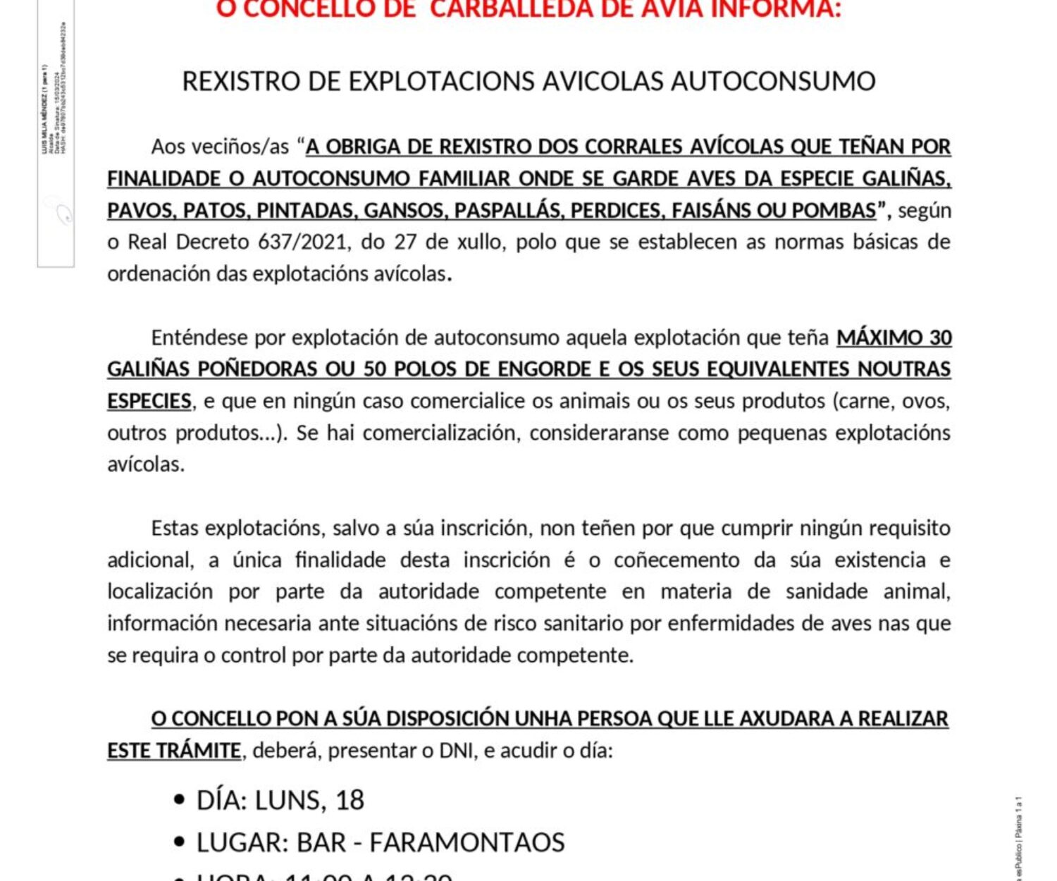 Anuncios, Novas 15 Mar 2024 BANDO O CONCELLO PON A SÚA DISPOSICIÓN UNHA PERSOA QUE LLE AXUDARÁ A REALIZAR O TRÁMITE, REXISTRO DE EXPLOTACIÓNS AVÍCOLAS AUTOCONSUMO… Info
