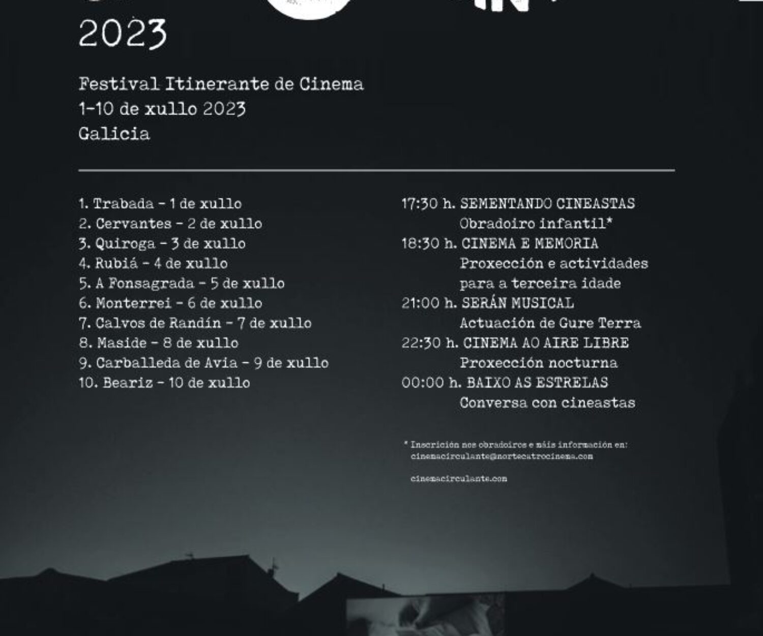 Anuncios, Eventos, Novas 22 Jun 2023 Festival Itinerante «Cinema circulante» – 09/07/2023 en Carballeda de Avia O vindeiro 01/07/2023 comeza "Cinema Circulante", un festival itinerante de cinema que se vai desenvolver en concellos do rural. O… Info