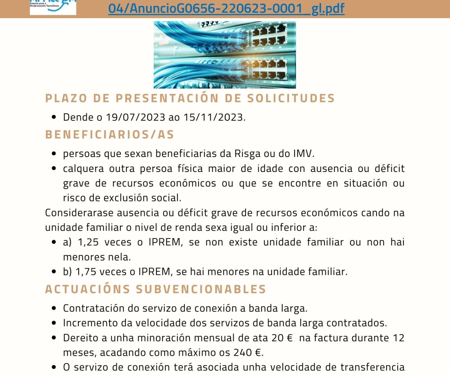 Anuncios, Economía e emprego, Novas, Subvencións 18 Jul 2023 BONOS DIXITAIS PARA A CONECTIVIDADE DE COLECTIVOS VULNERABLES (bono social) No DOG de hoxe publícase esta liña de axudas a particulares, que conta coas seguintes características: NON COMPETITIVA DOTACIÓN ORZAMENTARIA:… Info