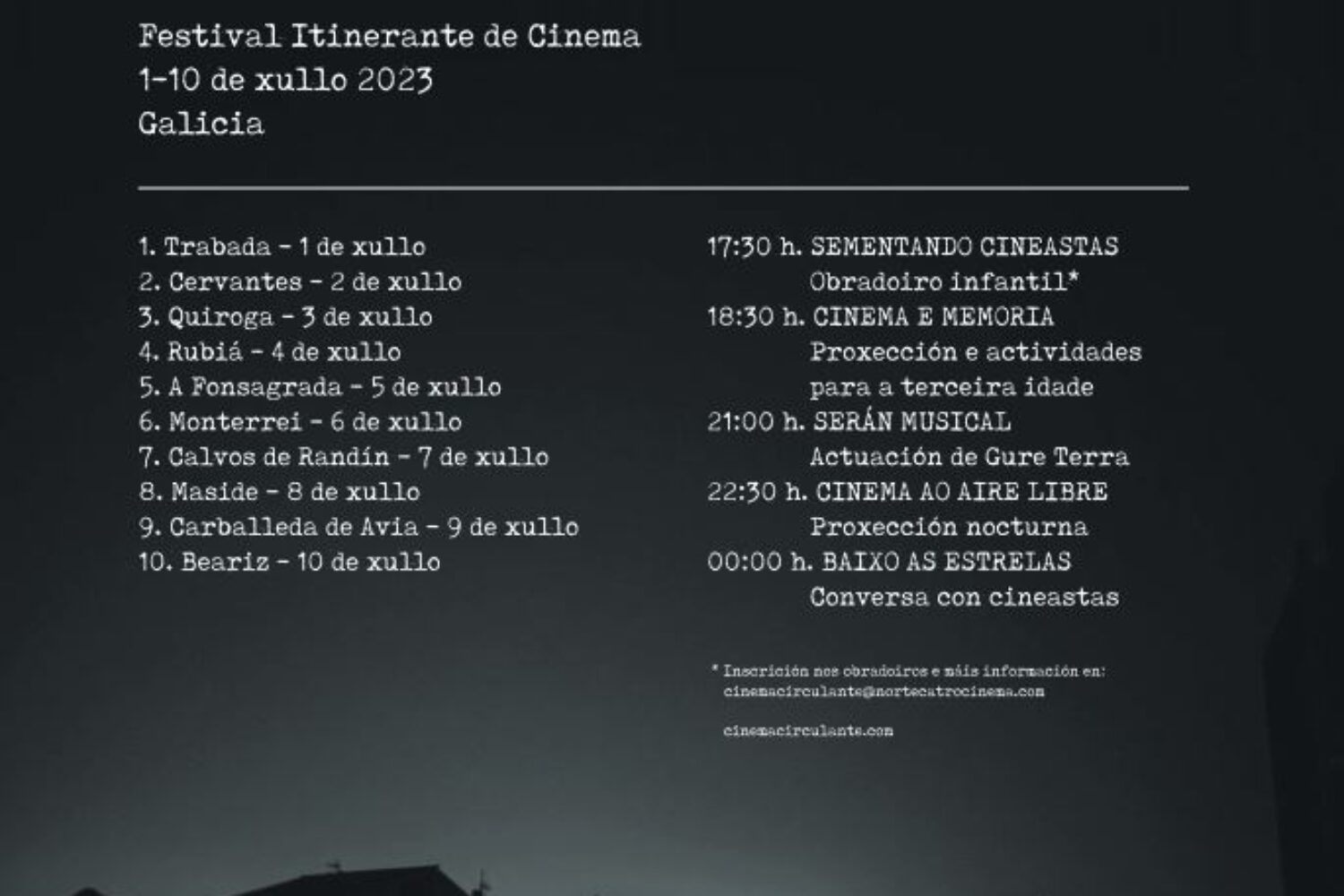 O percorrido desta primeira edición de Cinema Circulante atravesará as provincias de Lugo e Ourense dende o 1 ata o 10 de xullo, comezando por Trabada (1 de xullo), Cervantes (2 de xullo), Quiroga (3 de xullo), Rubiá (4 de xullo), A Fonsagrada (5 de xullo), Monterrei (6 de xullo), Calvos de Randín (7 de xullo), Maside (8 de xullo) Carballeda de Avia (9 de xullo) e rematando en Beariz o 10 de xullo. Máis información sobre as actividades e horarios en cada concello dispoñible en www.cinemacirculante.com ou nas canles oficiais das distintas redes sociais do proxecto (Facebook, Instagram, Twitter e Telegram).