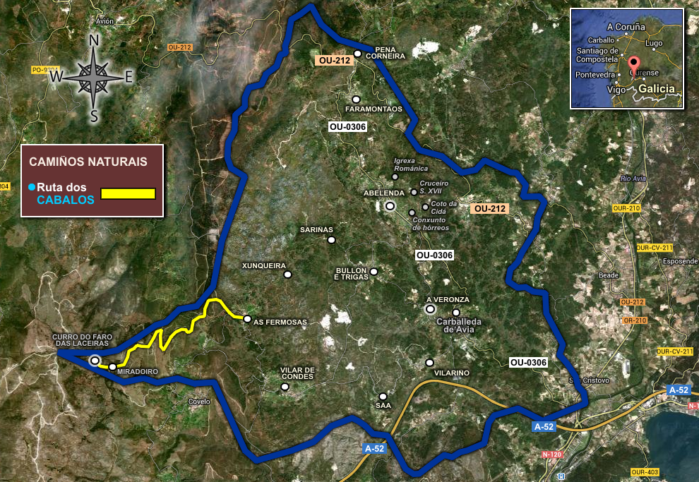 Esta ruta avanza por las zonas más elevadas de Carballeda de Avia por lo que gozarás de unas vistas espectaculares. Sin duda es una galería de cara al Ribeiro. Al final del camino es el Curro do Faro das Laceiras, que toma o su nombre de esta construcción. El «curro» es un corral circular vallado donde se guardan o encierran temporalmente los caballos que se crían en el monte, así como la operación de marcar, separar y rapar a los animales; y la fiesta que se desarrolla alrededor de esta actividad.
